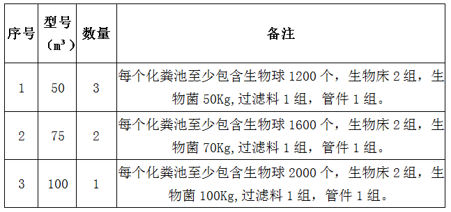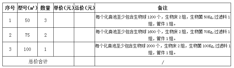 William威廉·尚含绿城化粪池采购工作。主要包括50m³化粪池3座、75m³化粪池2座、100m³化粪池1座。具体参数要求如下表: